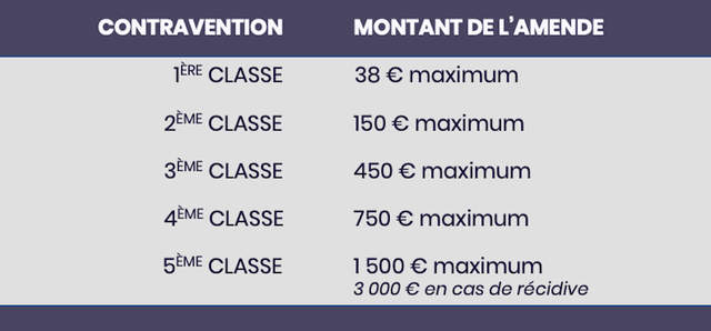 Il en existe 5 classes selon leur gravité. Selon la catégorie de l’amende, le montant maximal de l’amende encourue augmente et certaines infractions de 5ème classe peuvent se transformer en délit en cas de récidive.